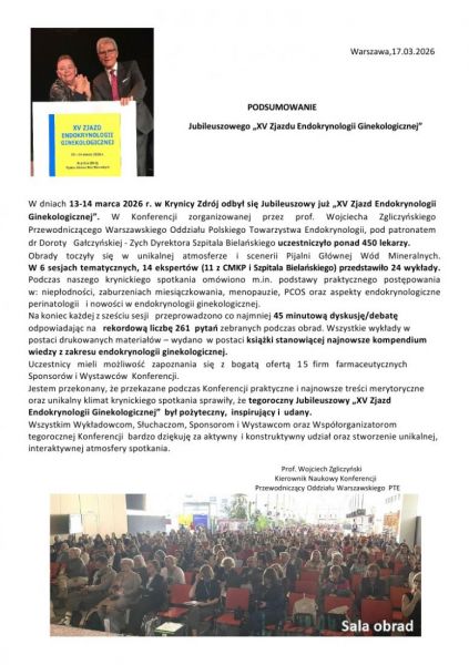 W dniach 13-14 marca 2026 r. w Krynicy Zdrój odbył się Jubileuszowy już „XV Zjazd Endokrynologii Ginekologicznej”. W Konferencji zorganizowanej przez prof. Wojciecha Zgliczyńskiego Przewodniczącego Warszawskiego Oddziału Polskiego Towarzystwa Endokrynologii, pod patronatem dr Doroty Gałczyńskiej - Zych Dyrektora Szpitala Bielańskiego uczestniczyło ponad 450 lekarzy.
